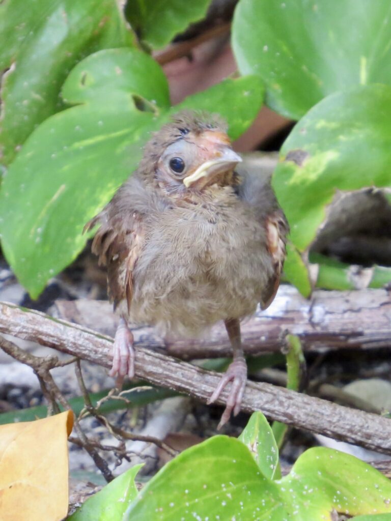 植木がたくさん植ってある地面で発見。巣から正味3メートルぐらいのところ。