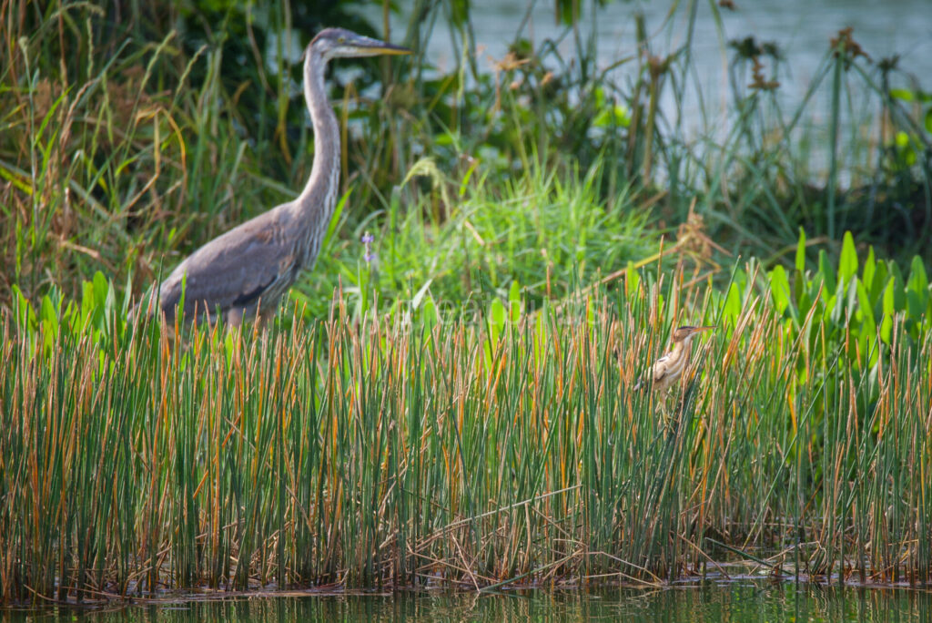 オオアオサギと比べるとこんなに違います。左奥がオオアオサギ、右手前がコヨシゴイ。